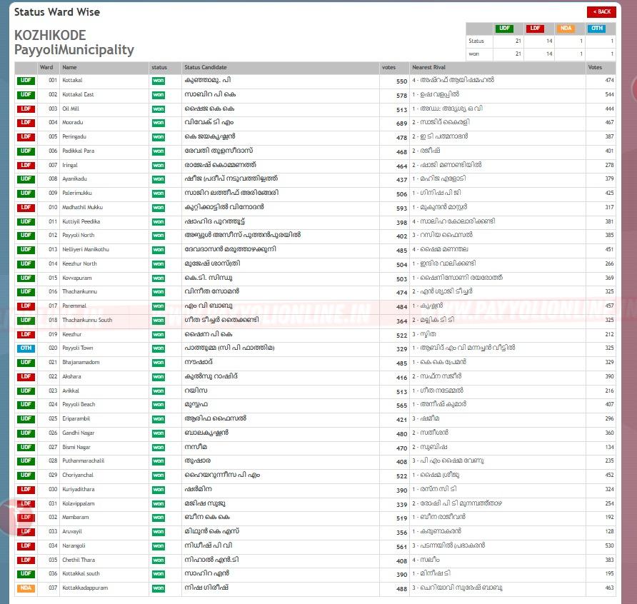 പയ്യോളി : സംസ്ഥാനത്ത് തദ്ദേശസ്വയംഭരണ സ്ഥാപനങ്ങളിലേക്ക് നടന്ന തെരഞ്ഞെടുപ്പിൽ യു.ഡി.എഫ് വലിയ മുന്നേറ്റം നേടി. പയ്യോളിയില് മൊത്തം 37 ഡിവിഷനുകളിൽ യു.ഡി.എഫ് 22 ഡിവിഷനുകളിൽ വിജയിച്ചപ്പോൾ എൽ.ഡി.എഫ് 14 ഡിവിഷനുകളിൽ മാത്രം വിജയിച്ചു. എൻ.ഡി. എ സ്ഥാനാർത്ഥി ഒരു ഡിവിഷനിൽ വിജയിച്ചു.