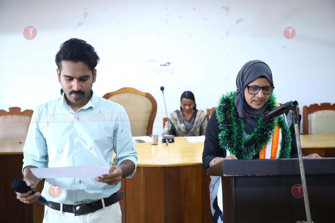 പയ്യോളി നഗരസഭ ചെയർപേഴ്സണായി തിരഞ്ഞടുക്കപെട്ട മുസ്ലിം ലീഗിലെ എൻ.സാഹിറക്ക് വരണാധികാരി ജില്ലാ വ്യവസായ കേന്ദ്രം മാനേജർ പി.നിധിൻ സത്യ വാചകം ചൊല്ലിക്കൊടുക്കുന്നു
