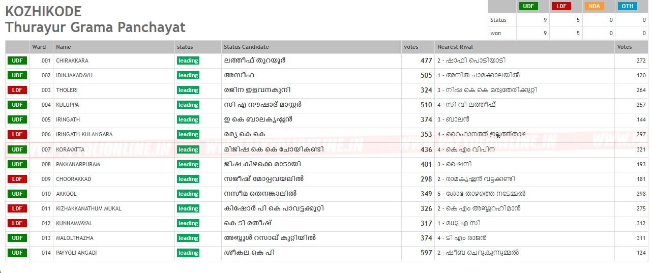 തെരഞ്ഞെടുപ്പ് ഫലം പുറത്തുവന്നപ്പോള് തുറയൂരില് എൽഡിഎഫിന് കനത്ത തിരിച്ചടി. യുഡി എഫ് 9 , എല് ഡി എഫ് -5